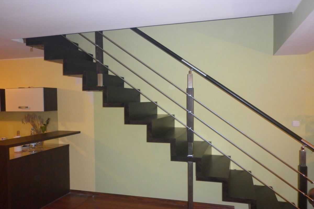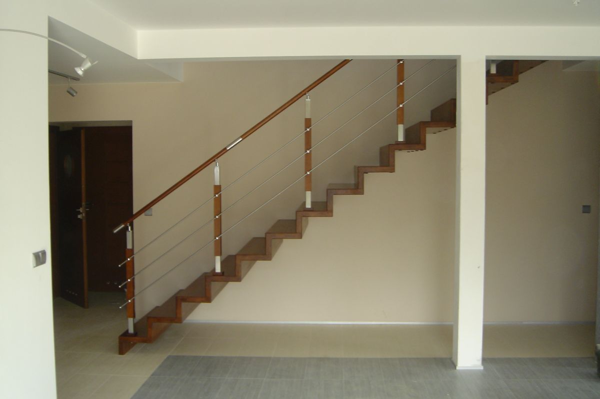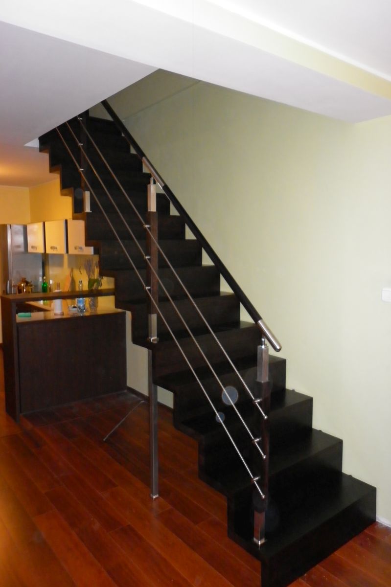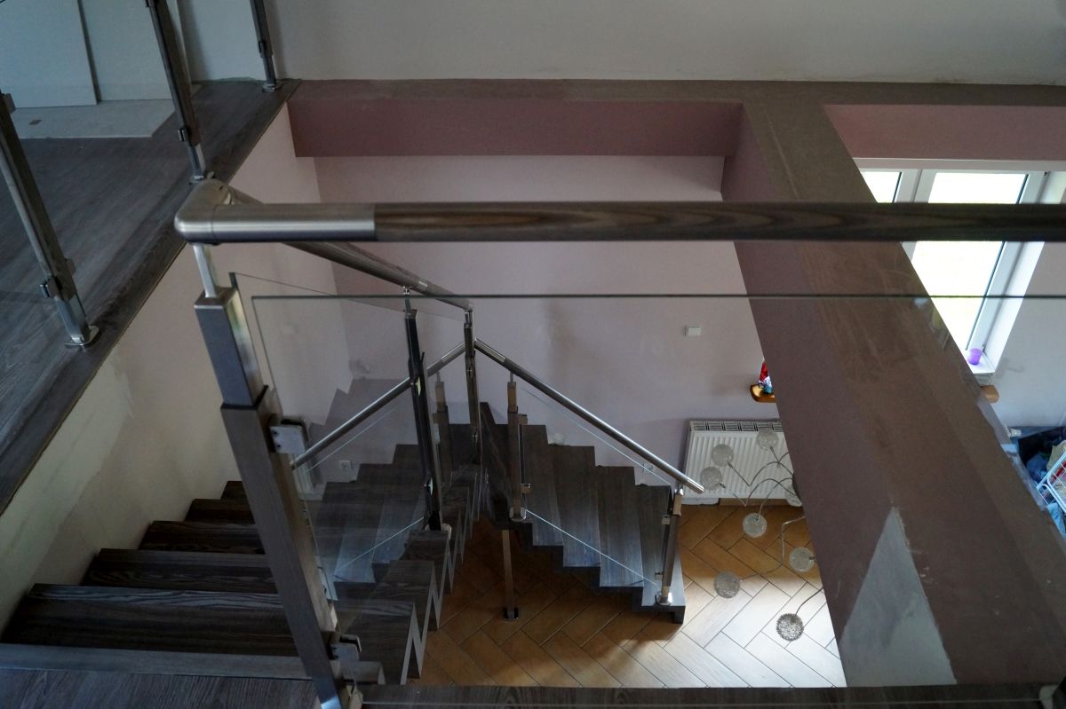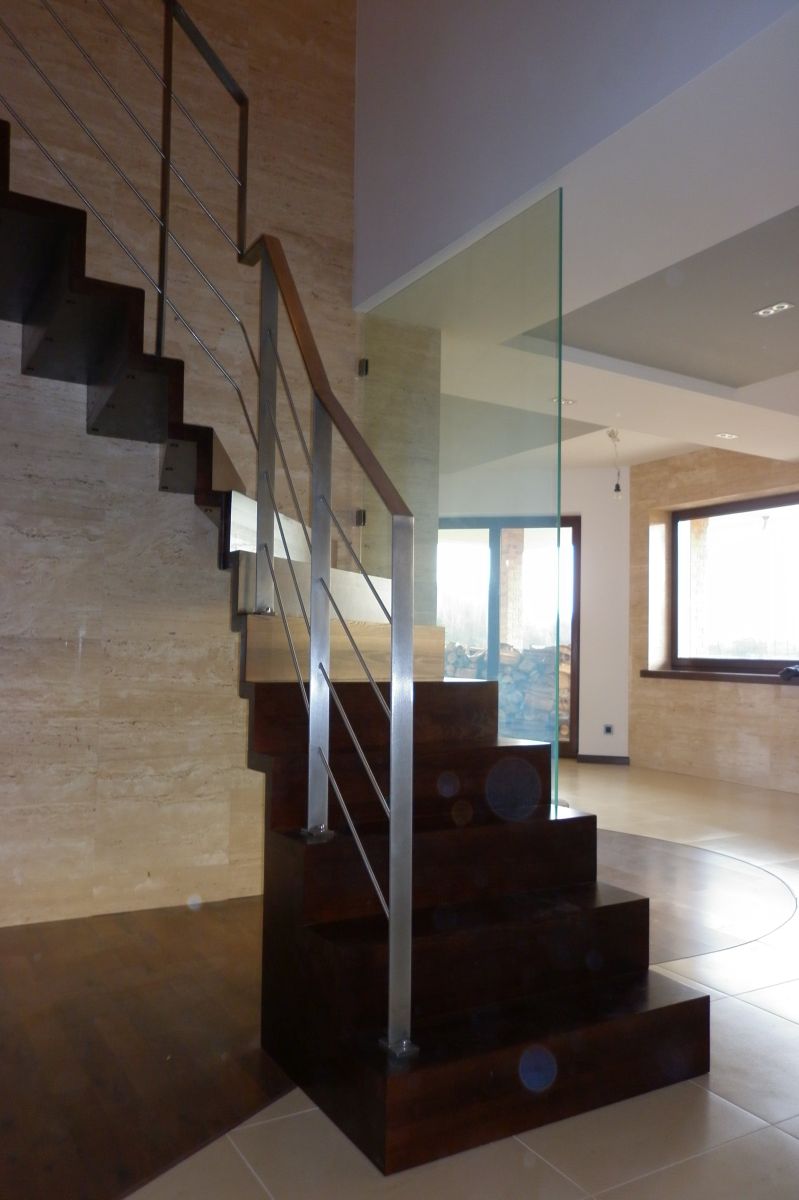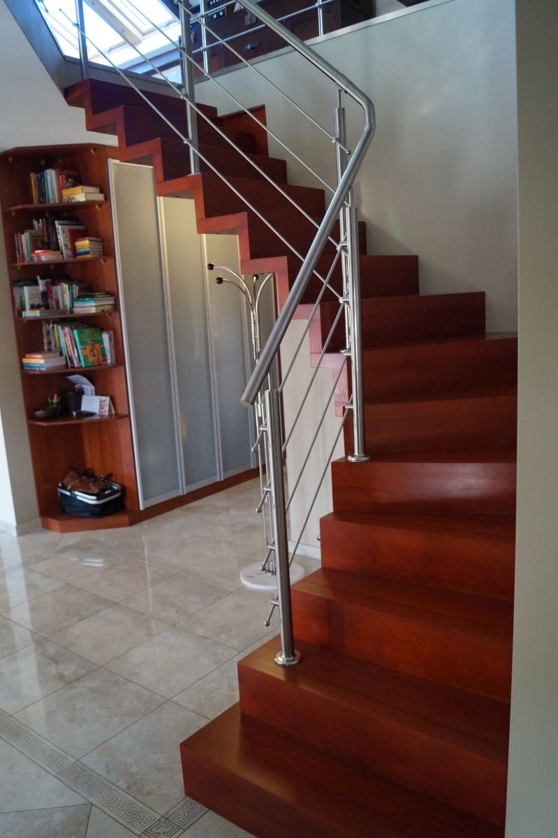 Do tego typu schodów proponujemy nowoczesne balustrady ze stali nierdzewnej połączone ze szkłem lub drewnem, ewentualnie balustradą całoszklaną.