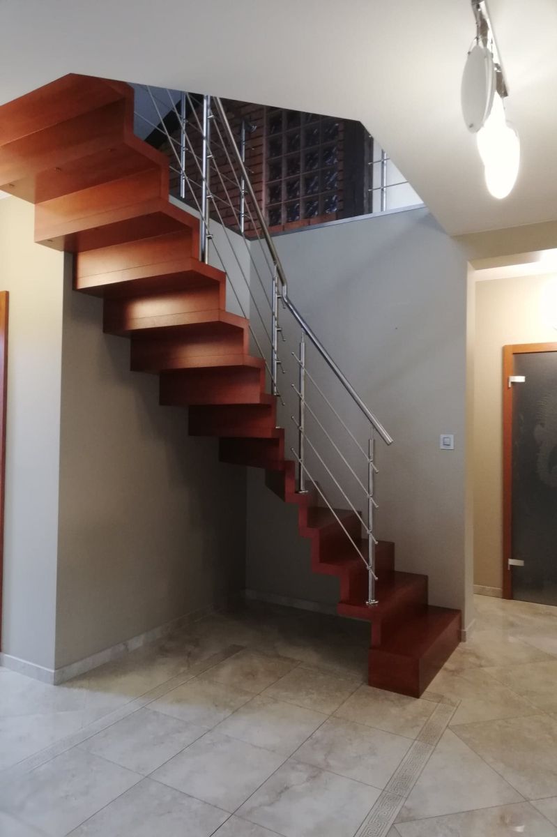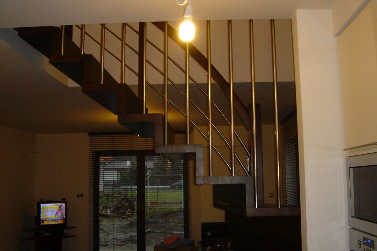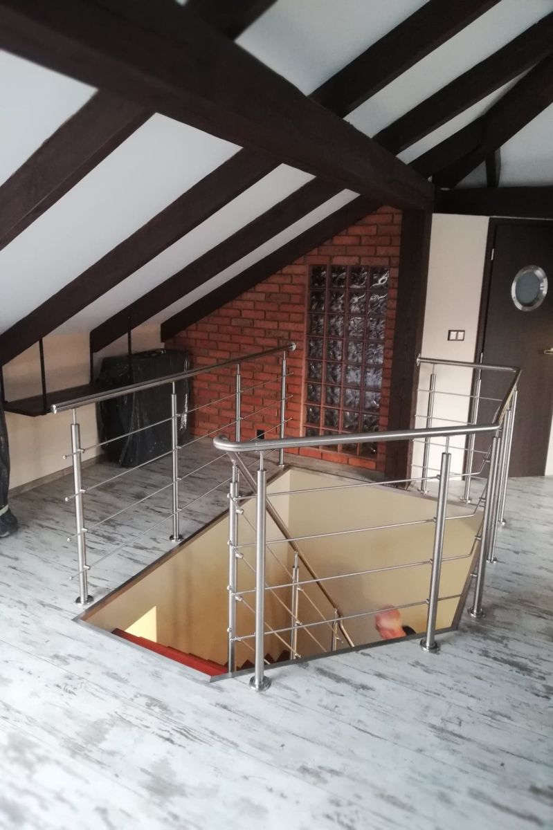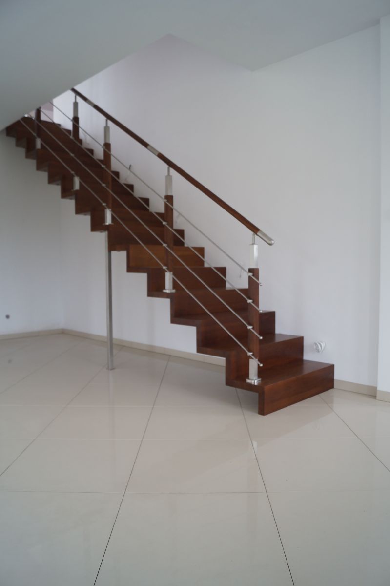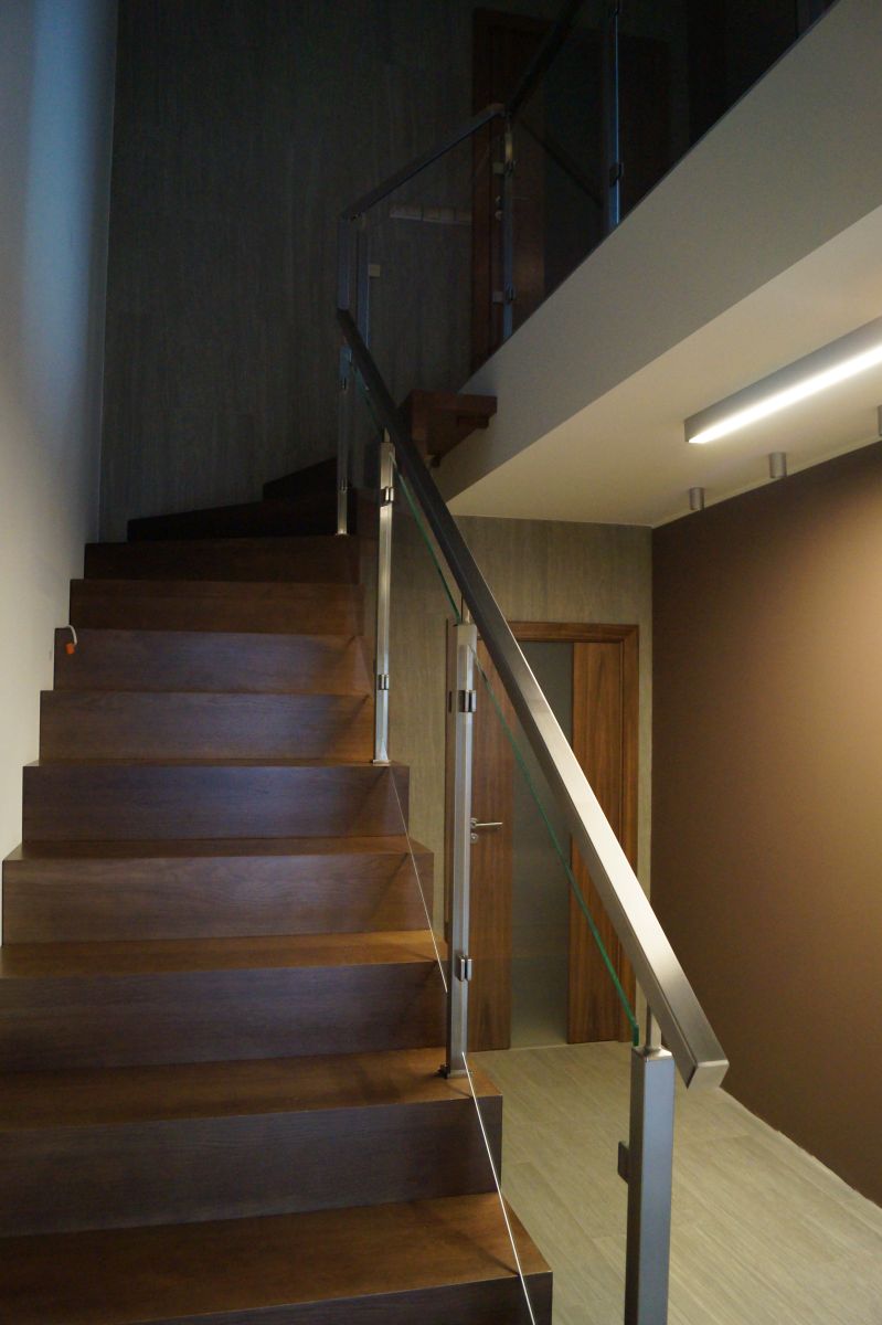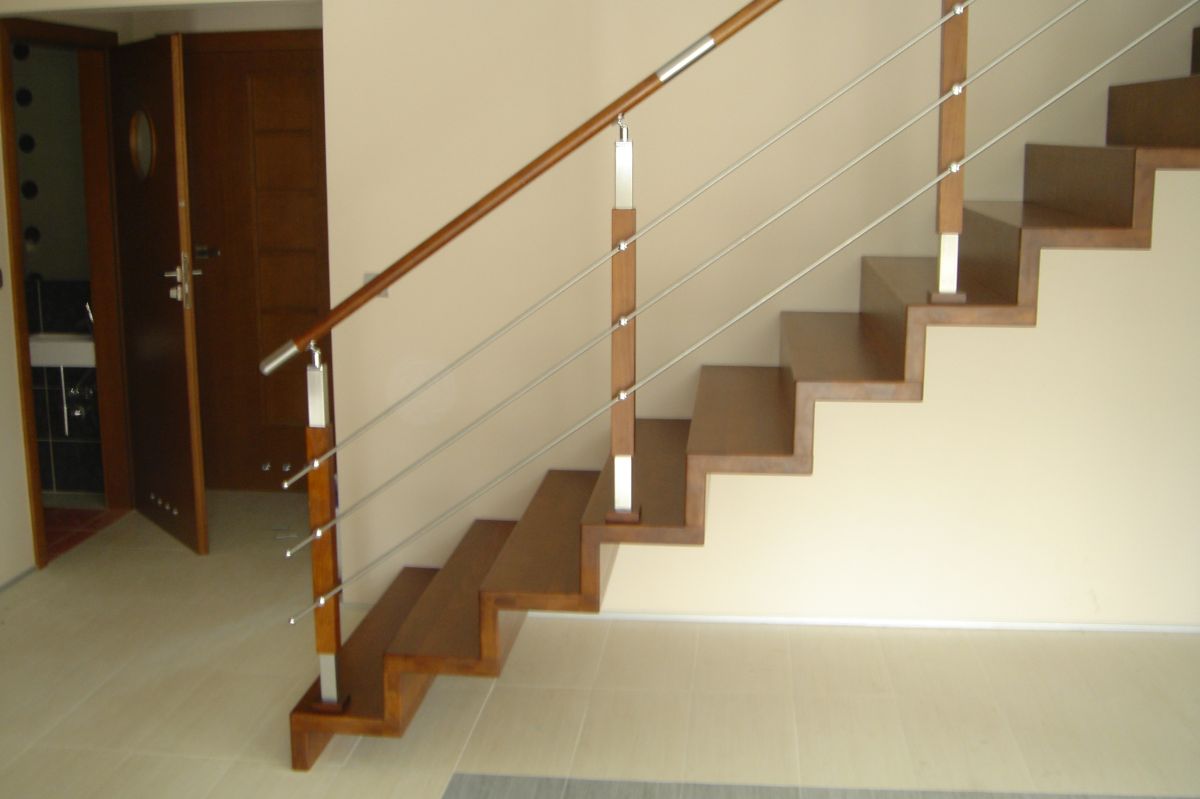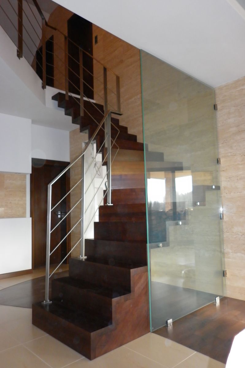 Do tego typu schodów proponujemy nowoczesne balustrady ze stali nierdzewnej połączone ze szkłem lub drewnem, ewentualnie balustradą całoszklaną.