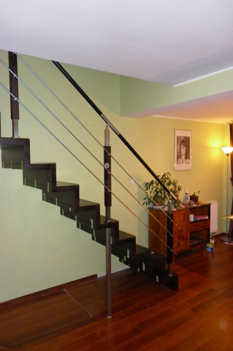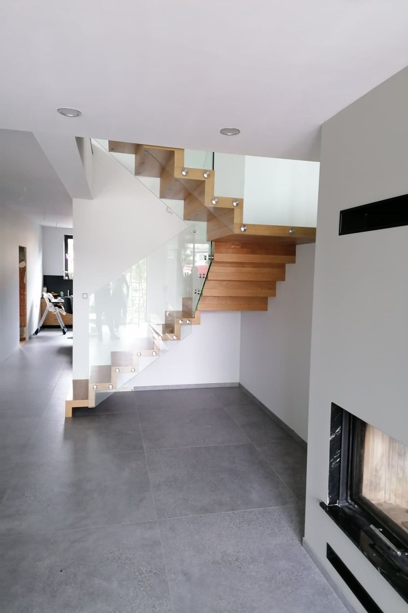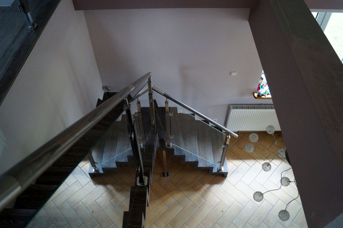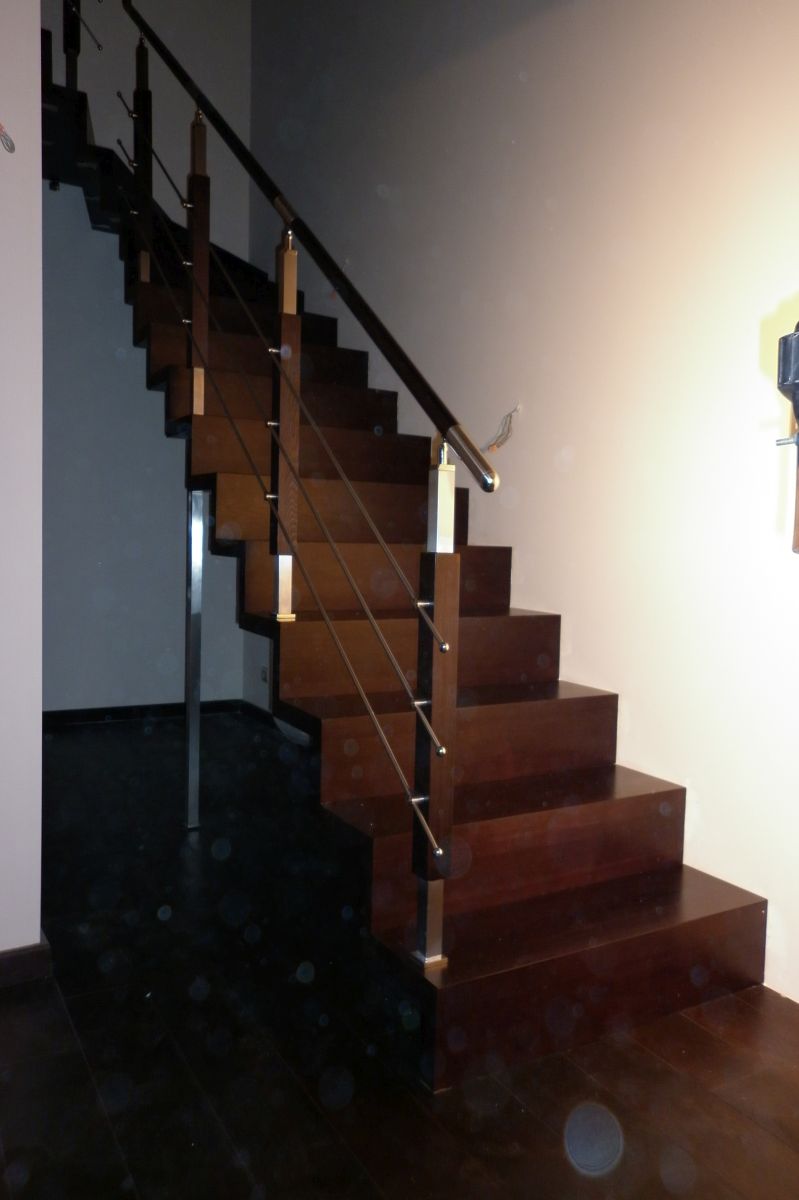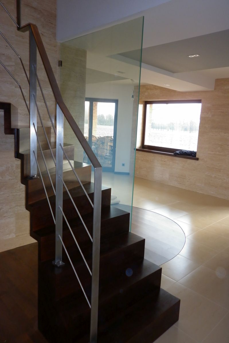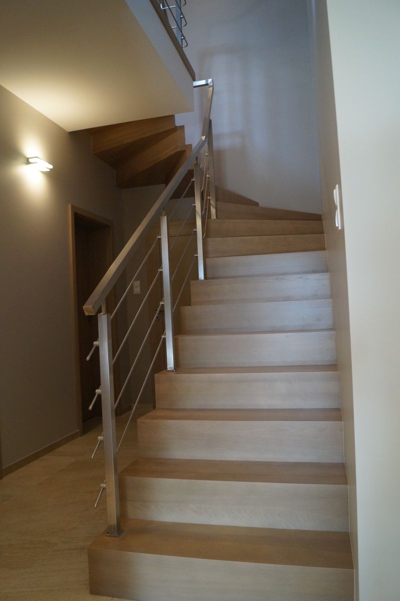 Do tego typu schodów proponujemy nowoczesne balustrady ze stali nierdzewnej połączone ze szkłem lub drewnem, ewentualnie balustradą całoszklaną.