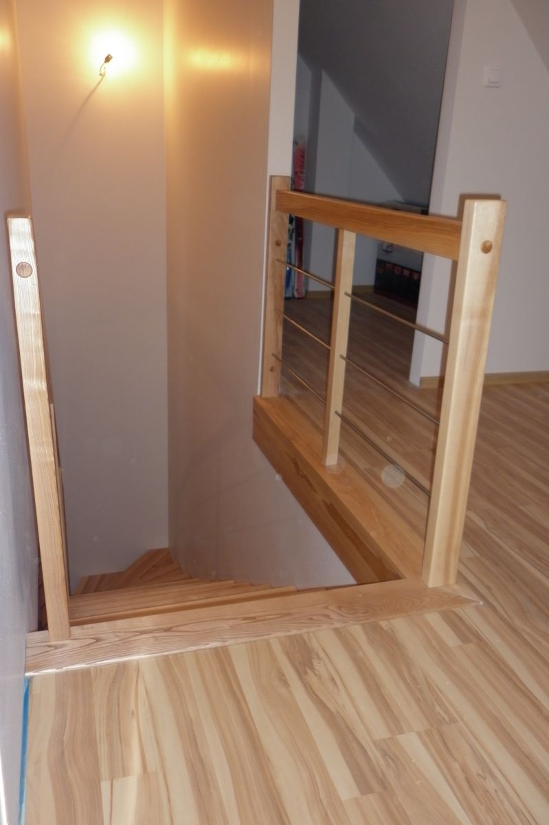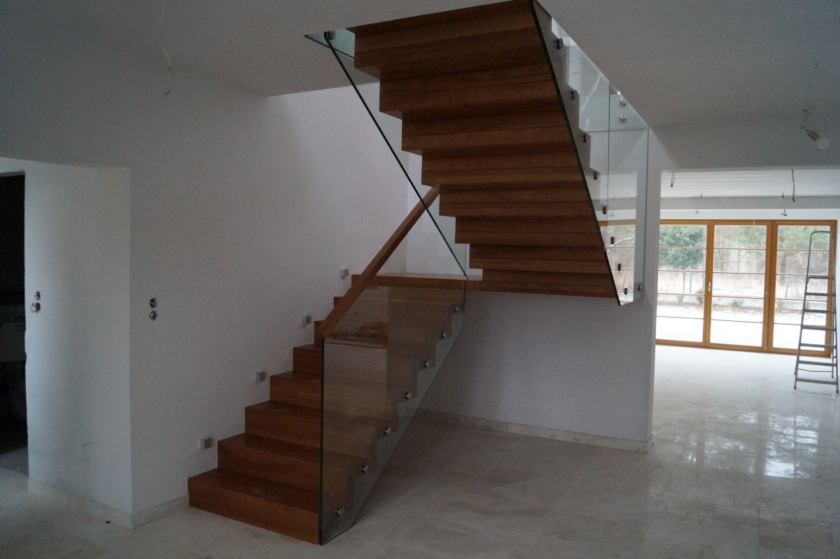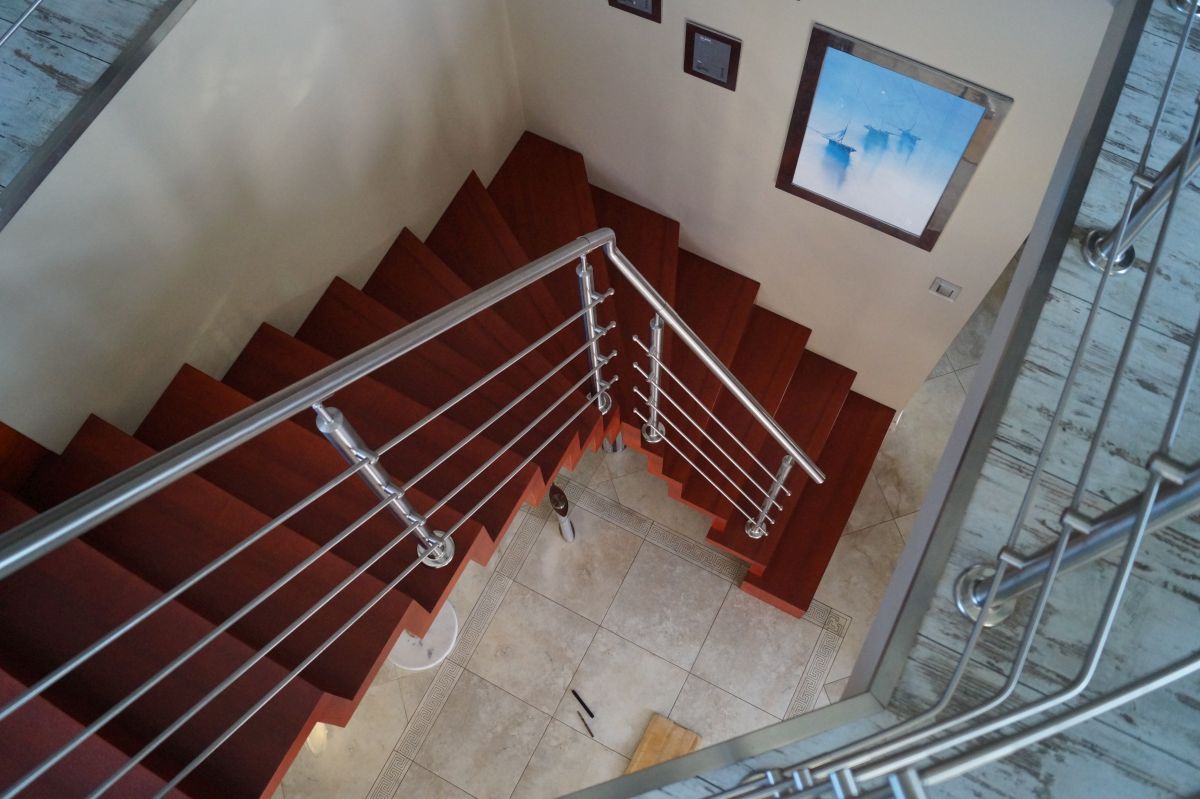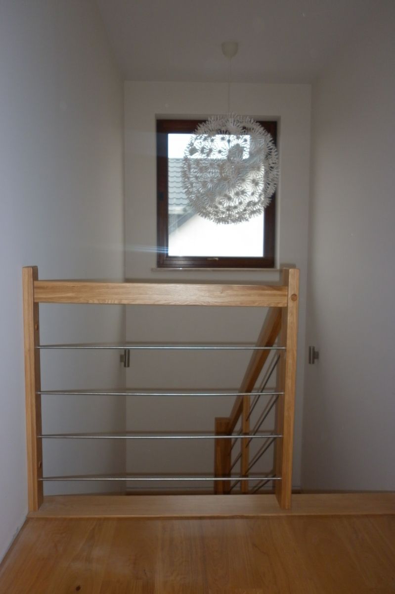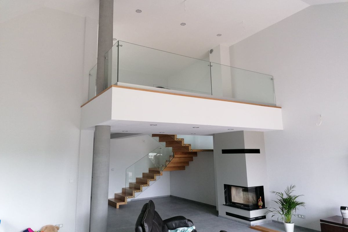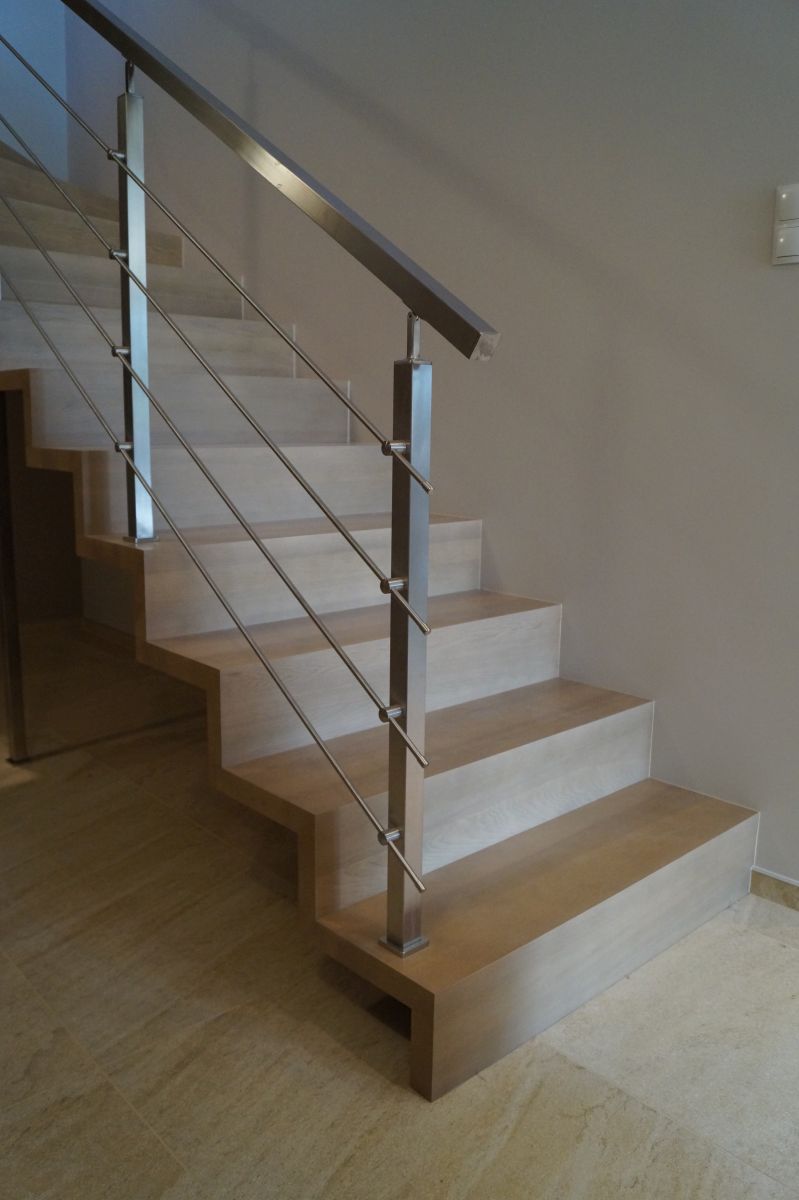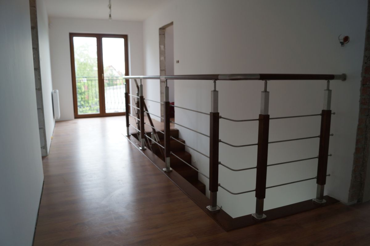 Do tego typu schodów proponujemy nowoczesne balustrady ze stali nierdzewnej połączone ze szkłem lub drewnem, ewentualnie balustradą całoszklaną.