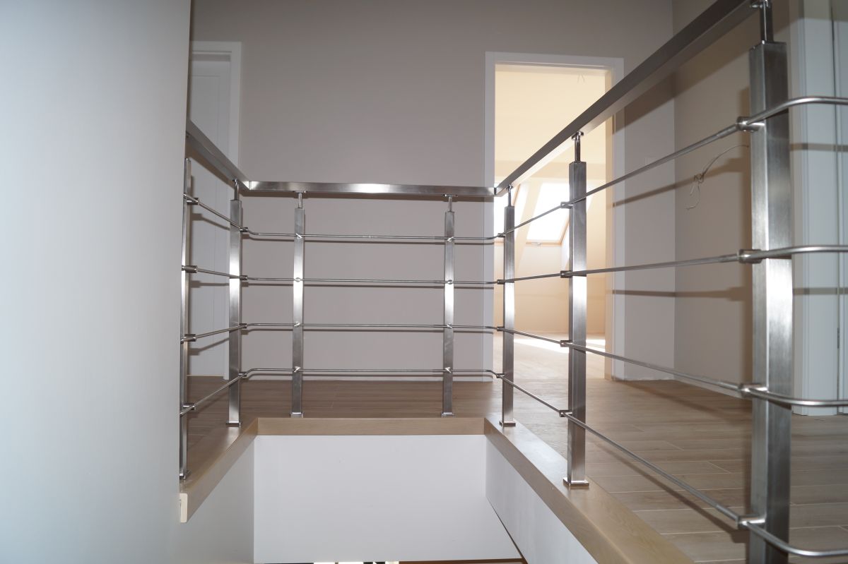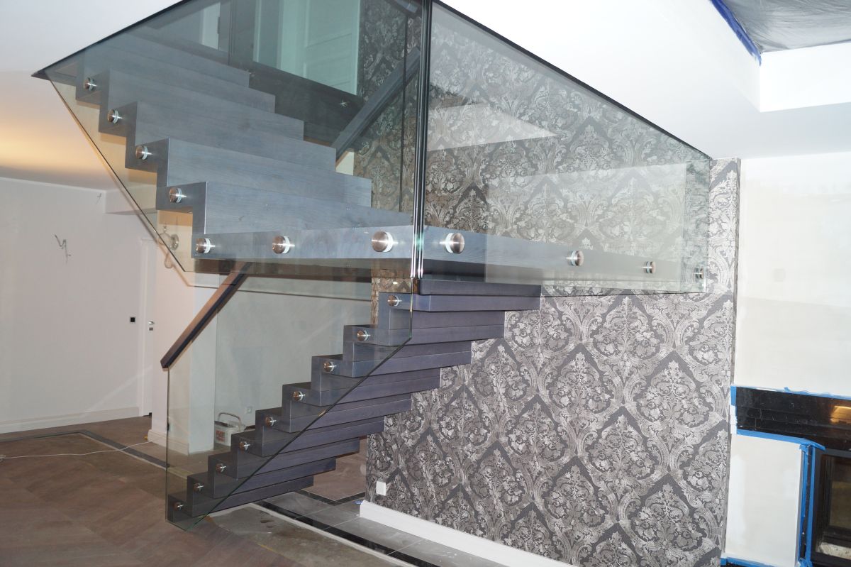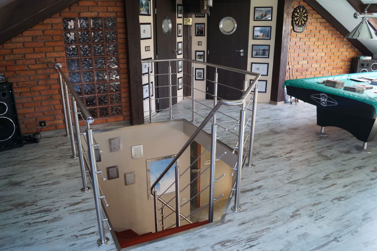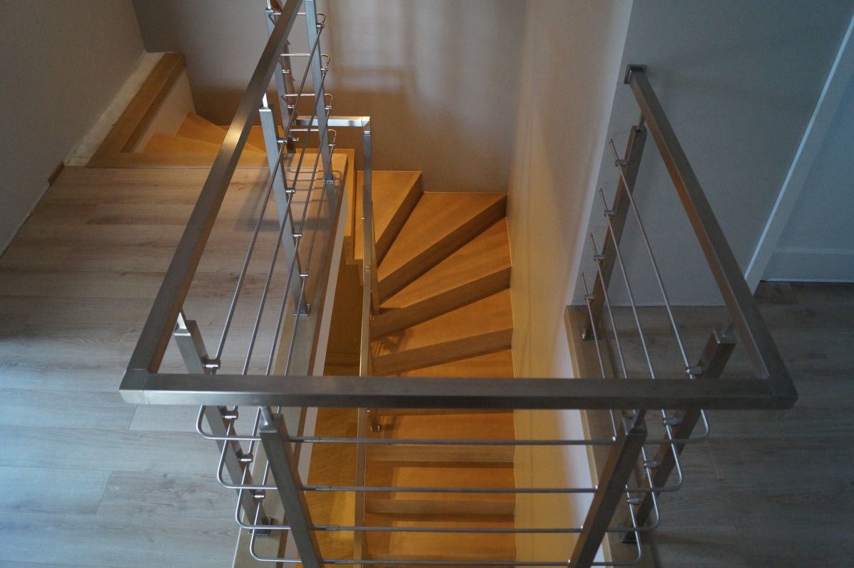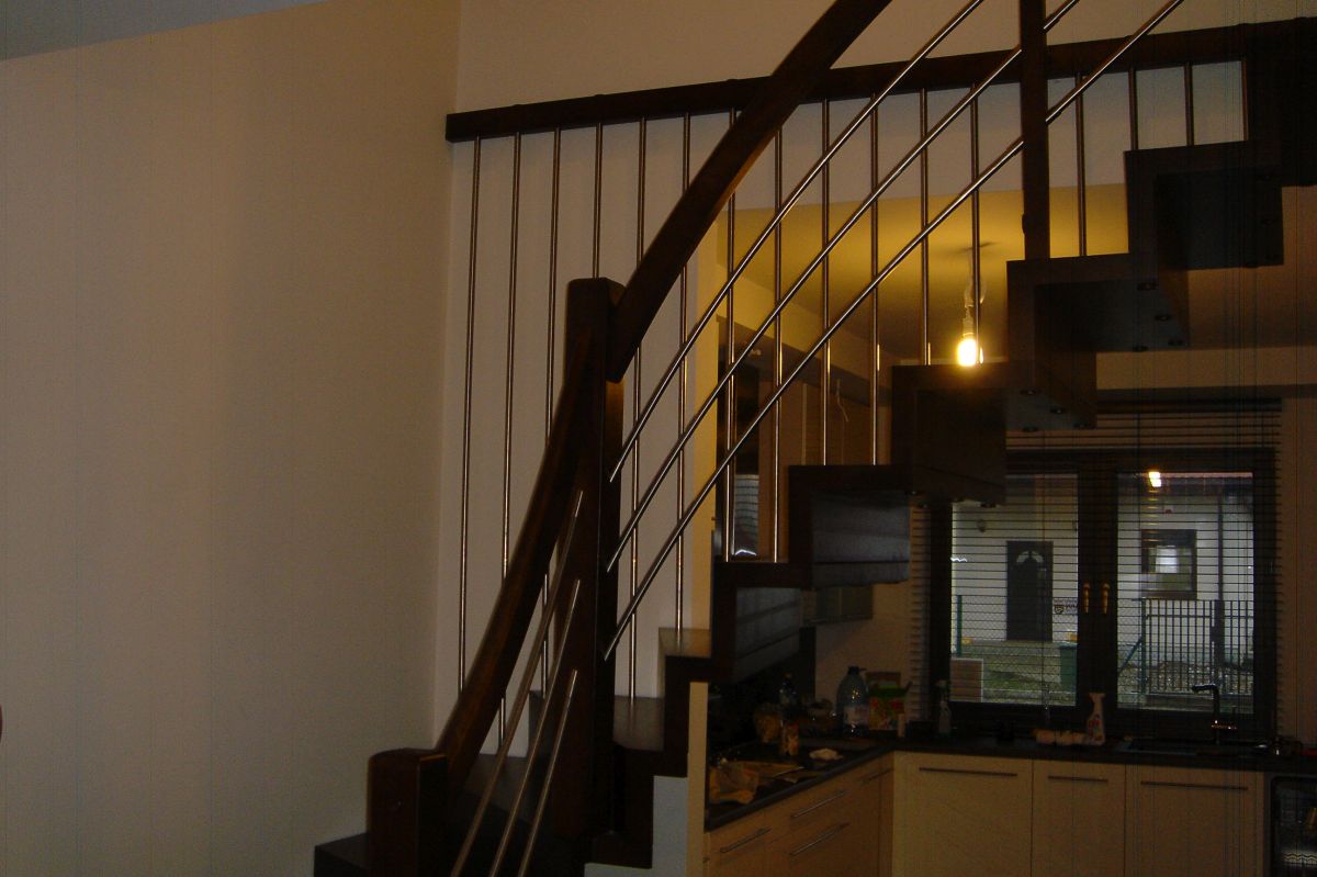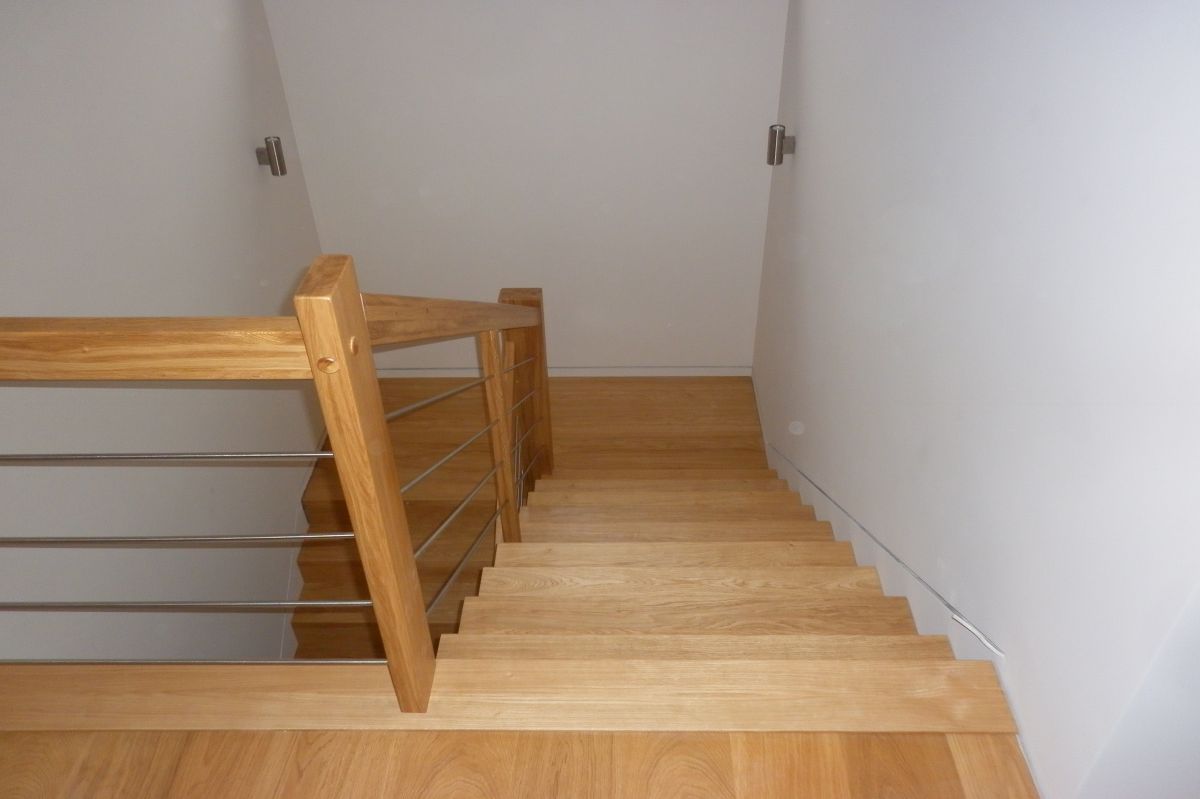 Do tego typu schodów proponujemy nowoczesne balustrady ze stali nierdzewnej połączone ze szkłem lub drewnem, ewentualnie balustradą całoszklaną.
