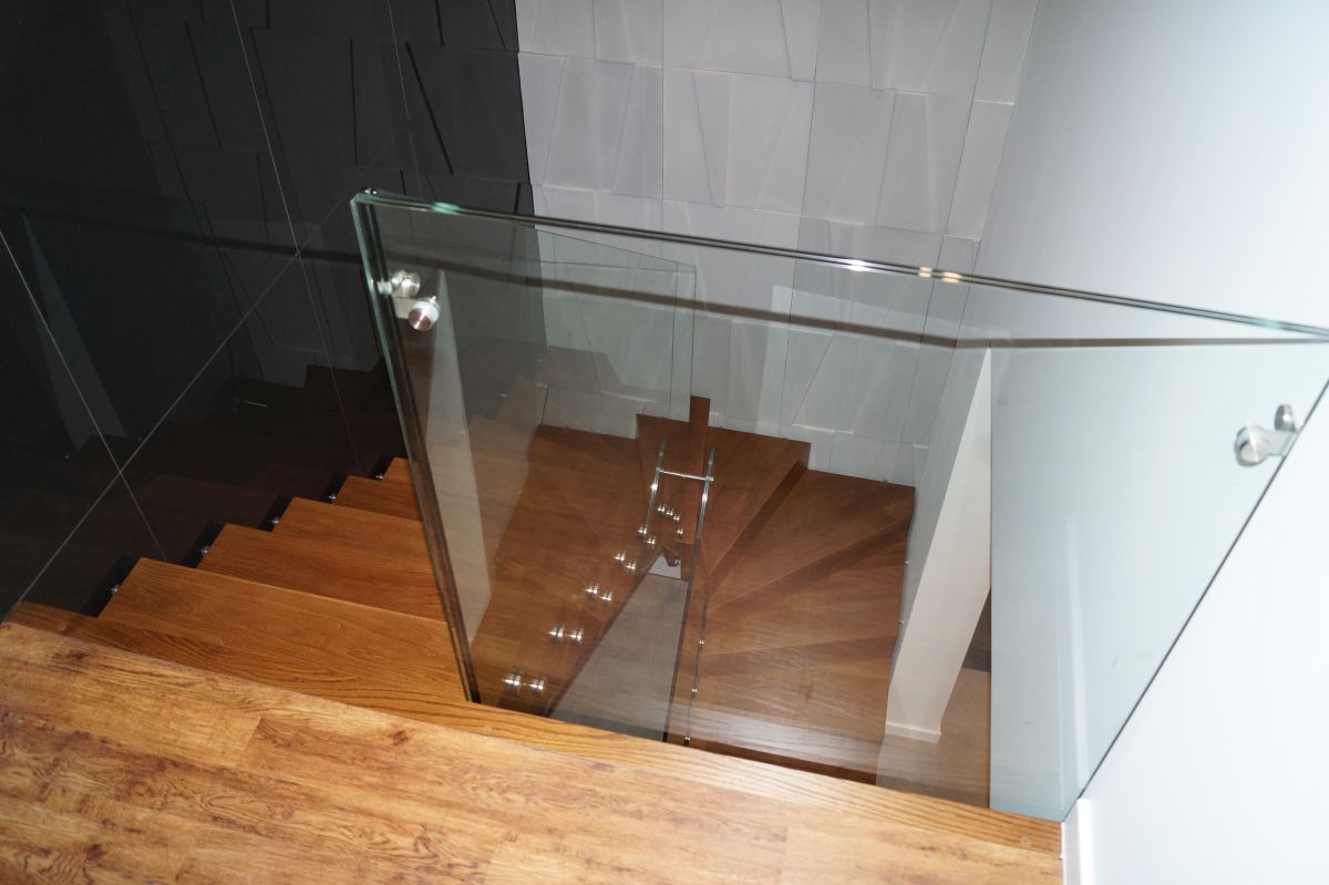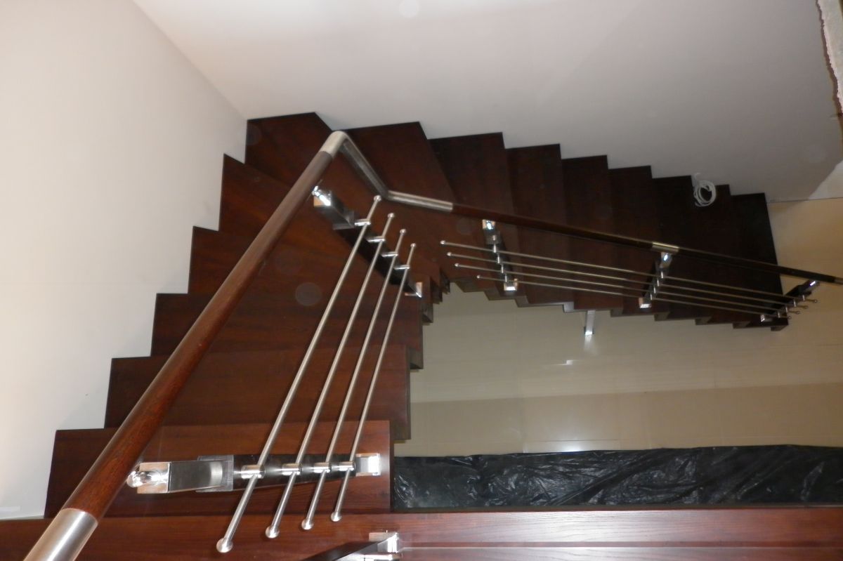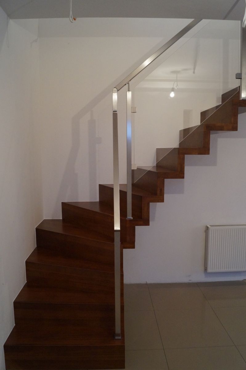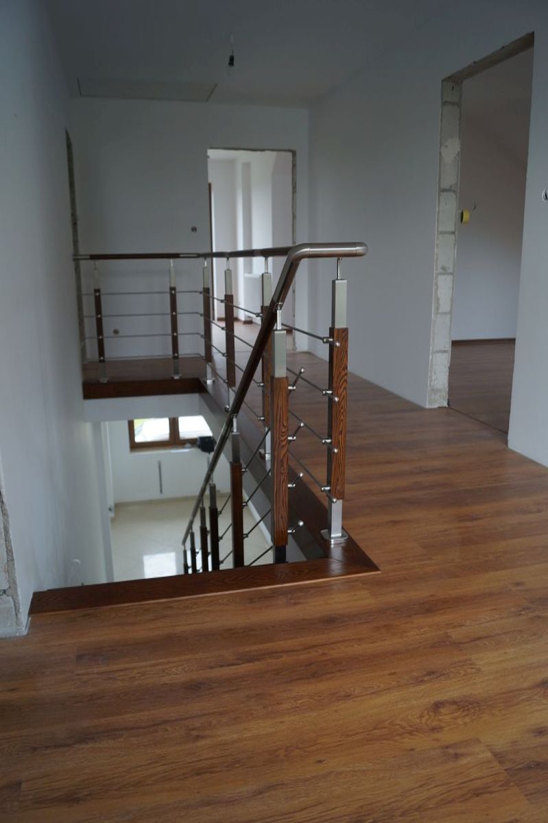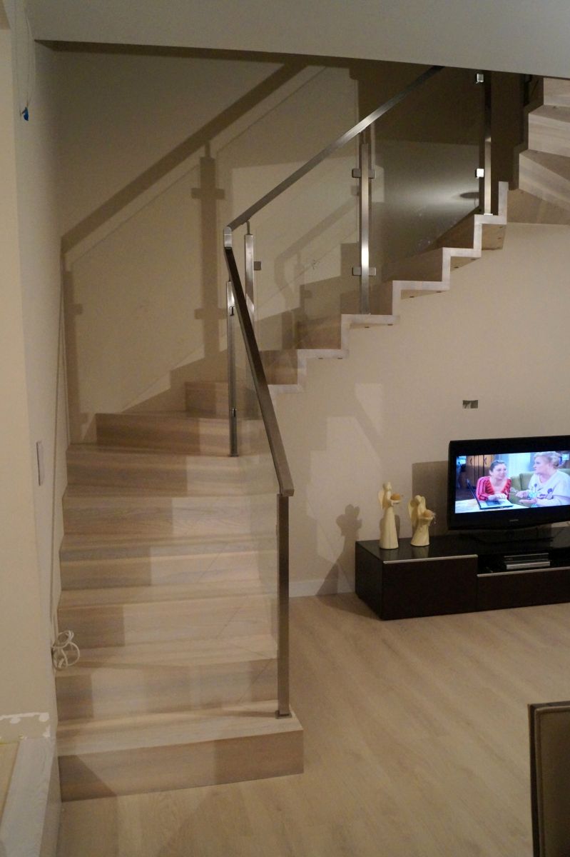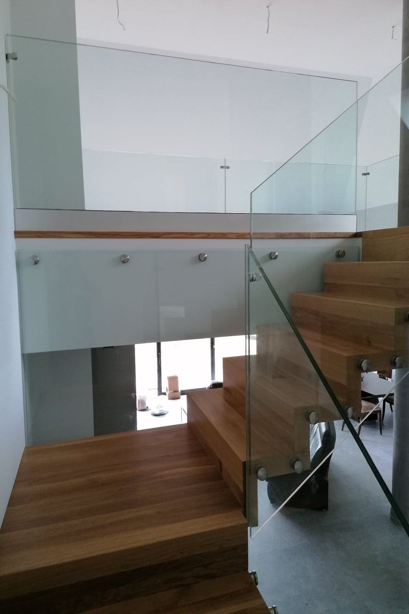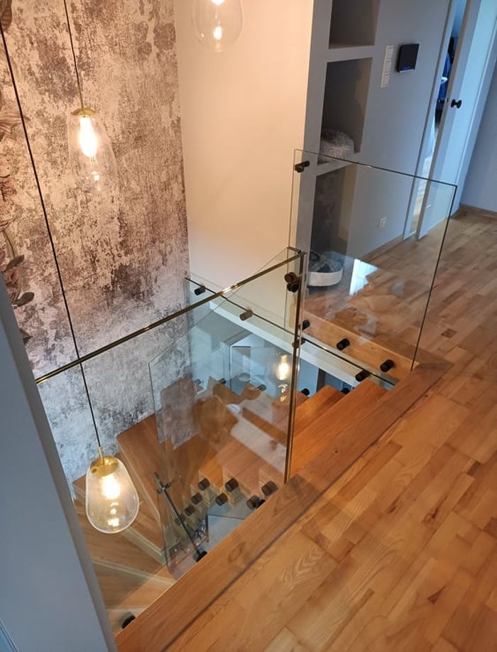 Do tego typu schodów proponujemy nowoczesne balustrady ze stali nierdzewnej połączone ze szkłem lub drewnem, ewentualnie balustradą całoszklaną.
