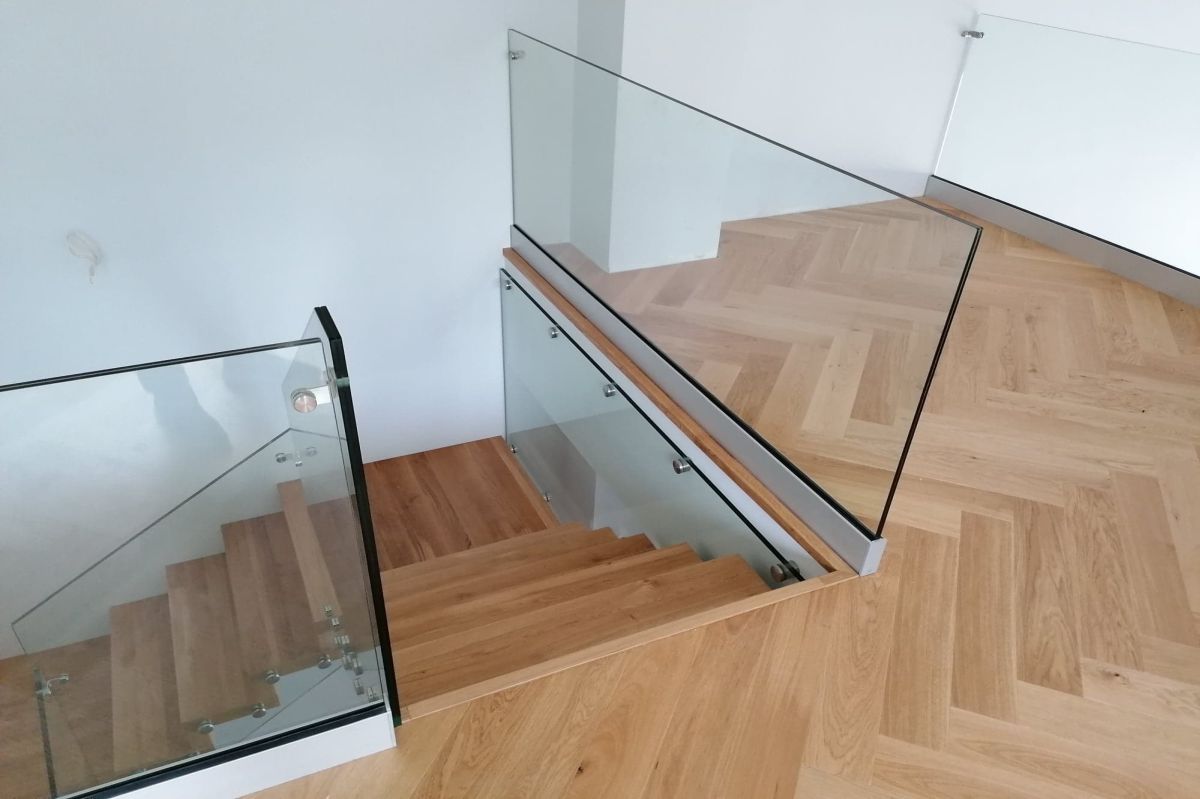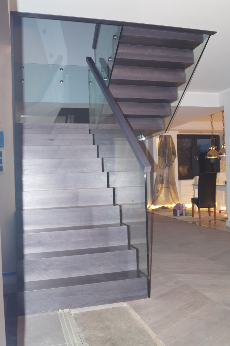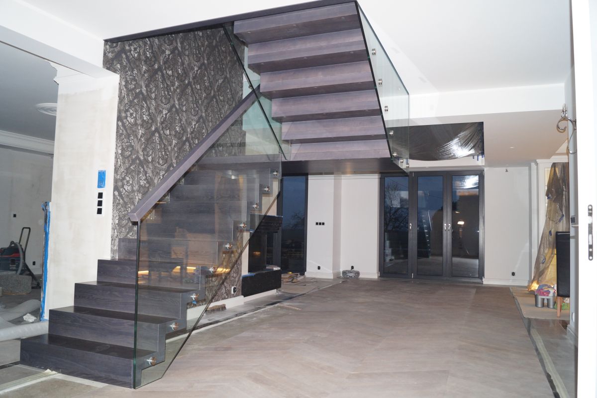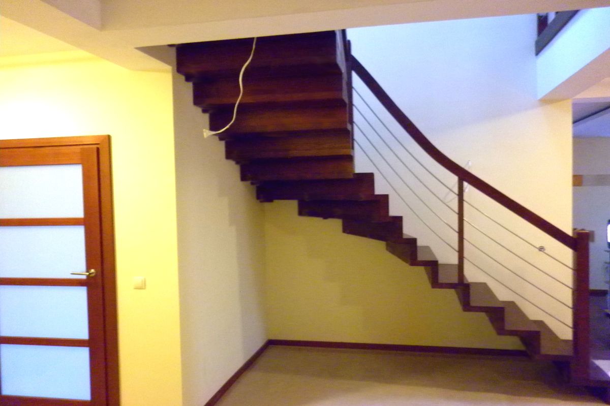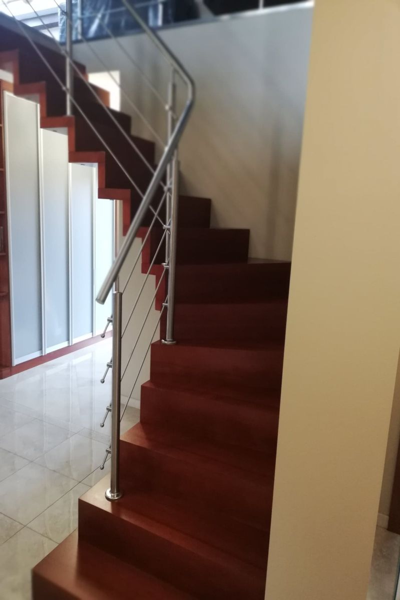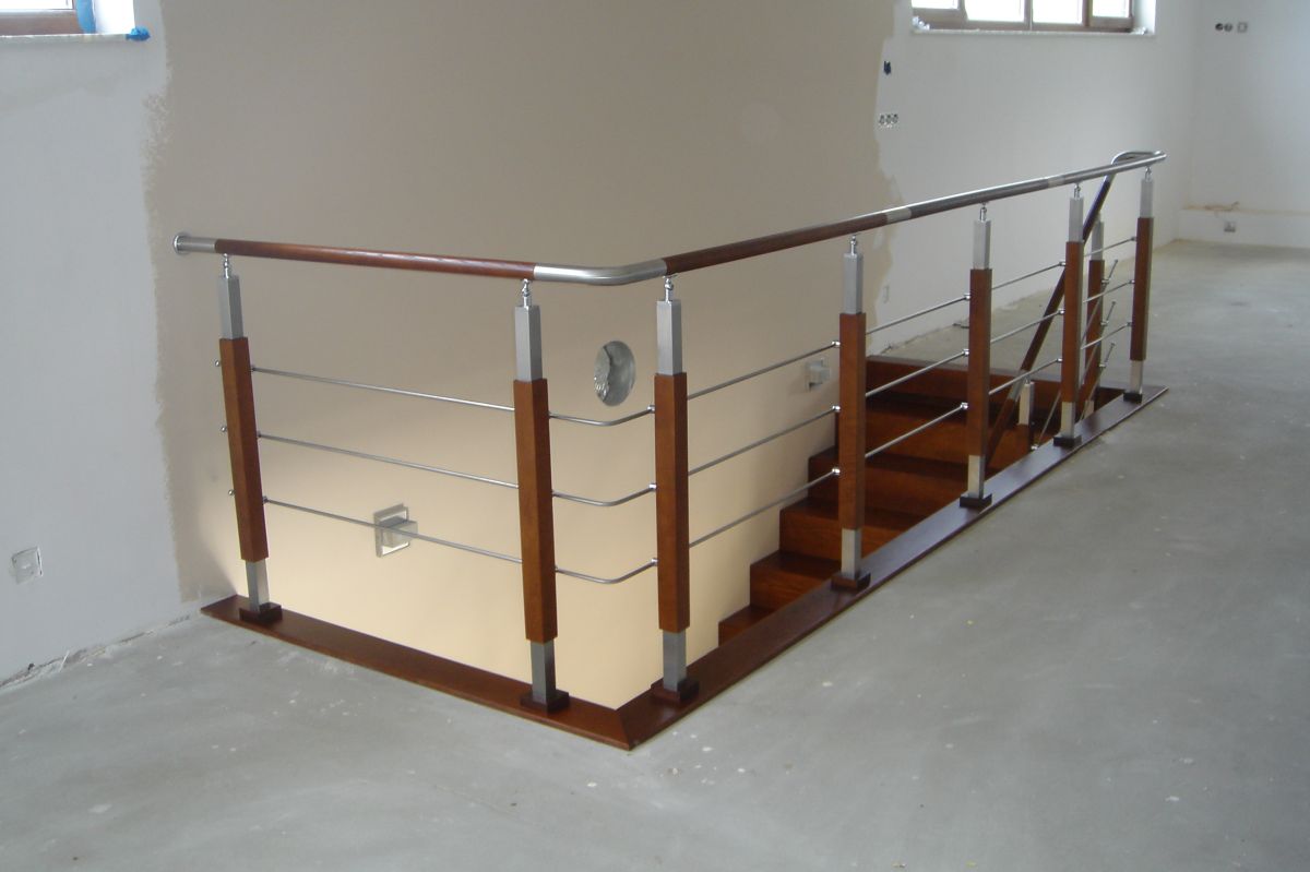 Do tego typu schodów proponujemy nowoczesne balustrady ze stali nierdzewnej połączone ze szkłem lub drewnem, ewentualnie balustradą całoszklaną.