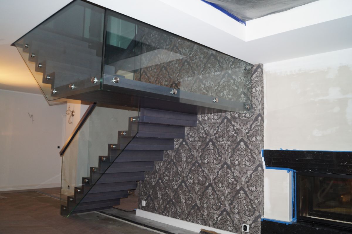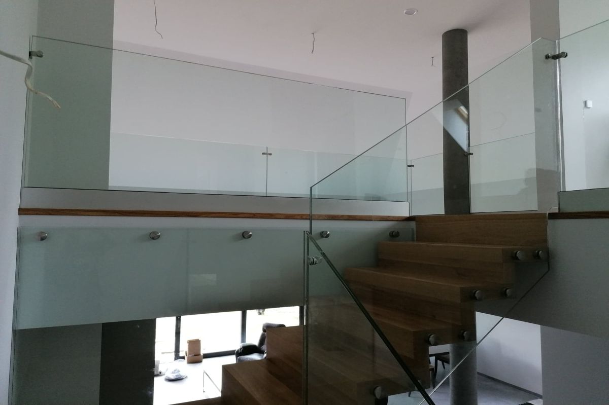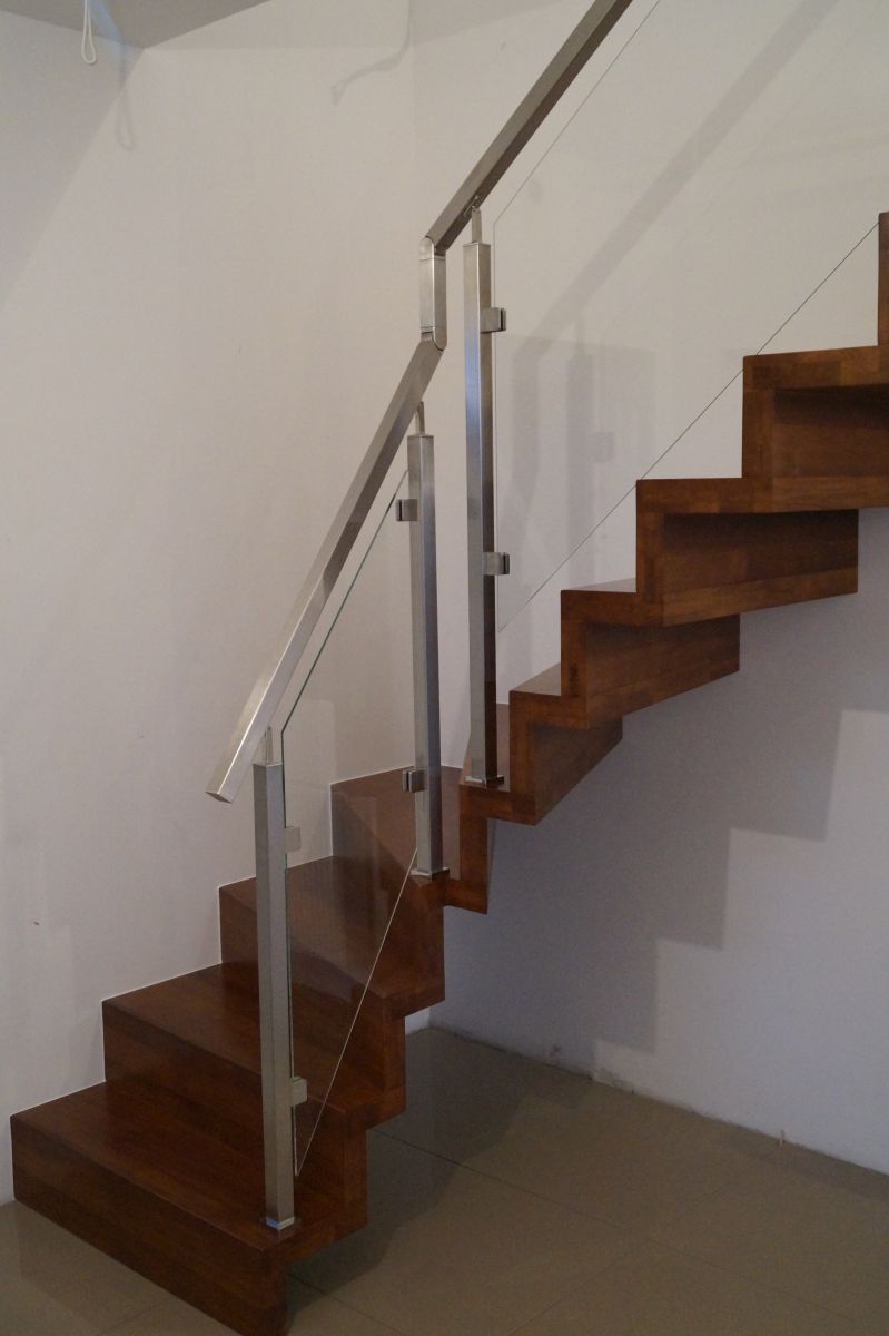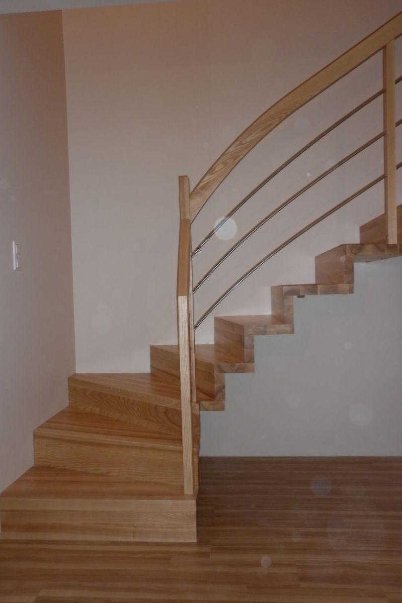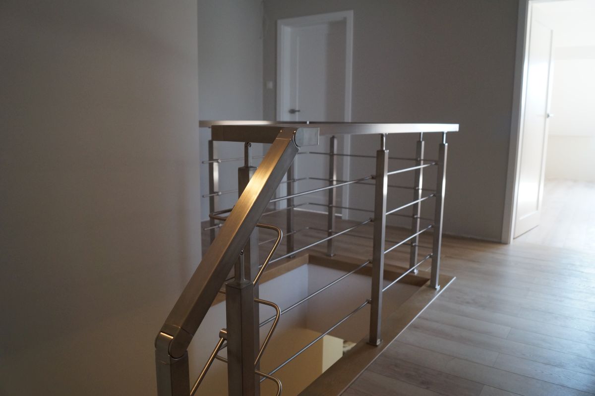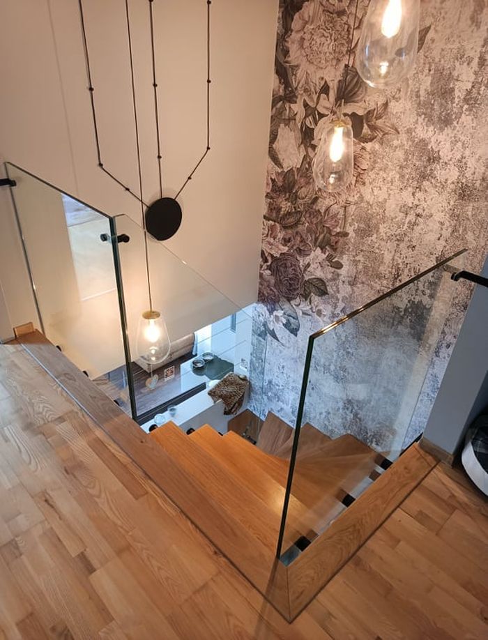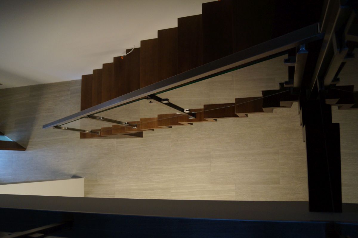 Do tego typu schodów proponujemy nowoczesne balustrady ze stali nierdzewnej połączone ze szkłem lub drewnem, ewentualnie balustradą całoszklaną.