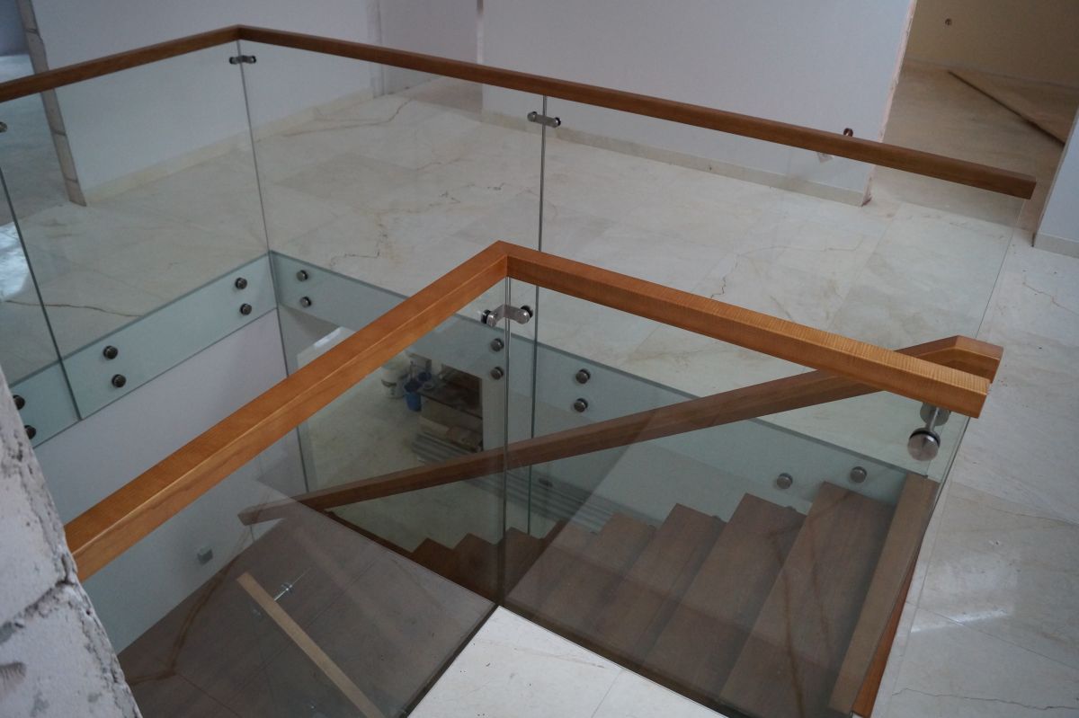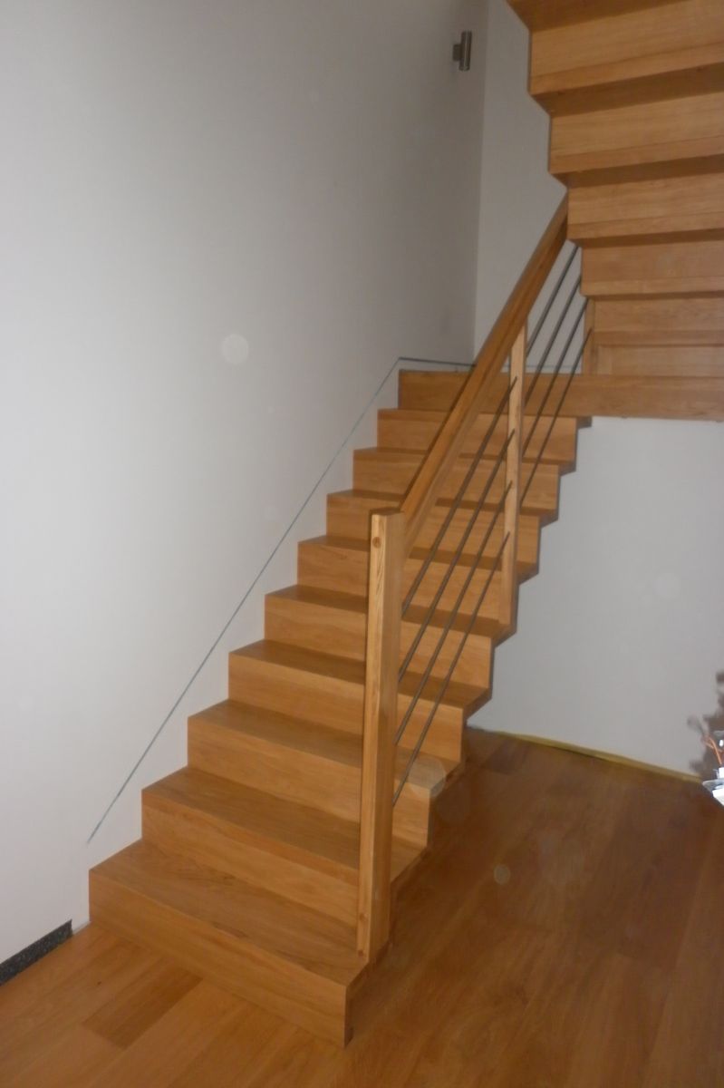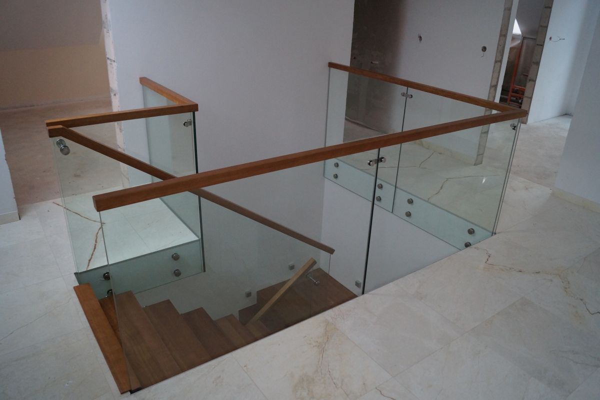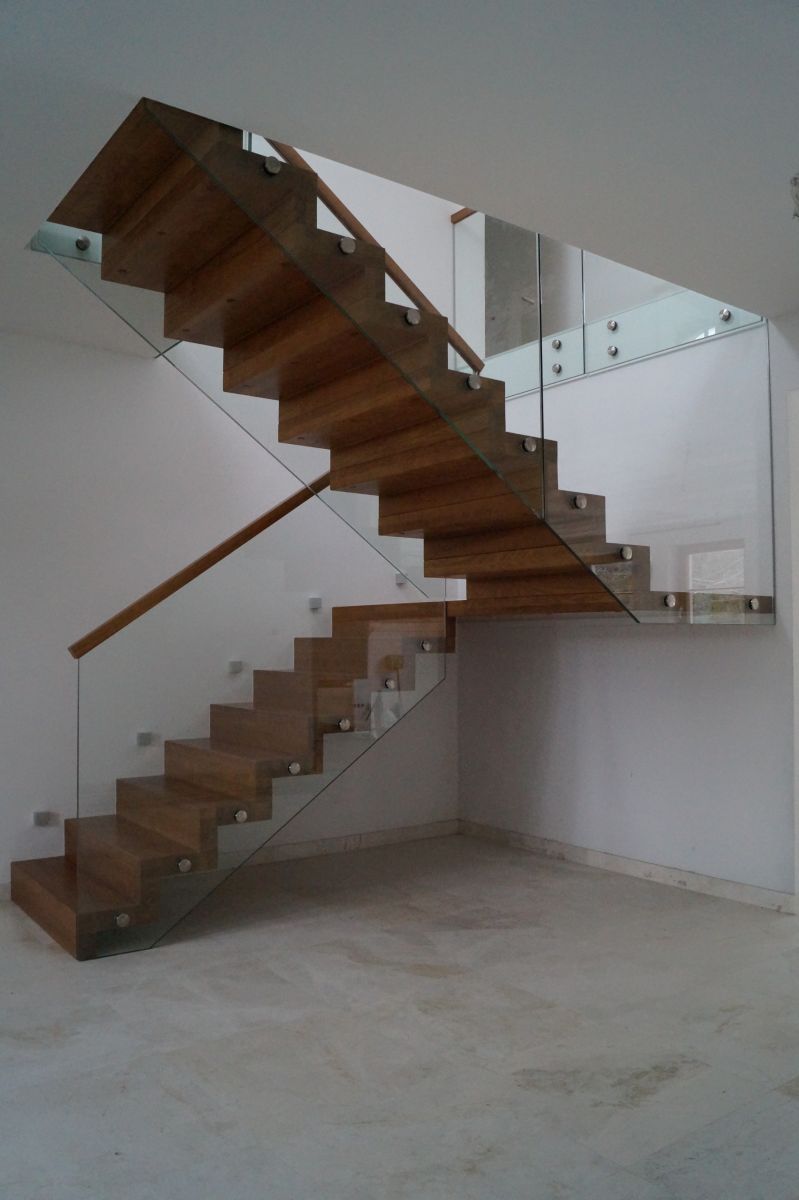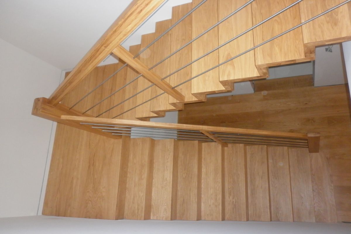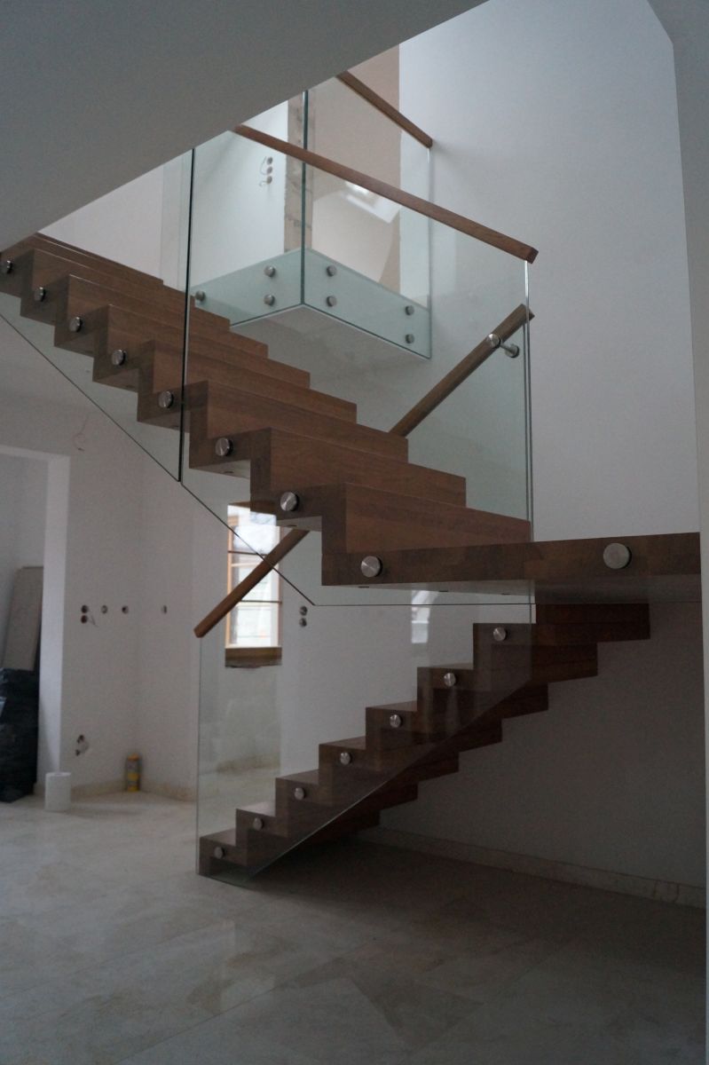 Do tego typu schodów proponujemy nowoczesne balustrady ze stali nierdzewnej połączone ze szkłem lub drewnem, ewentualnie balustradą całoszklaną.