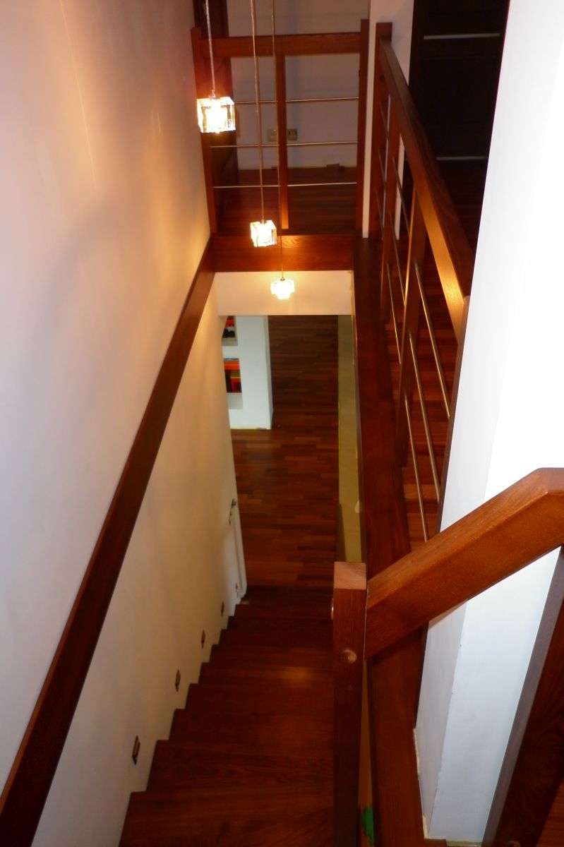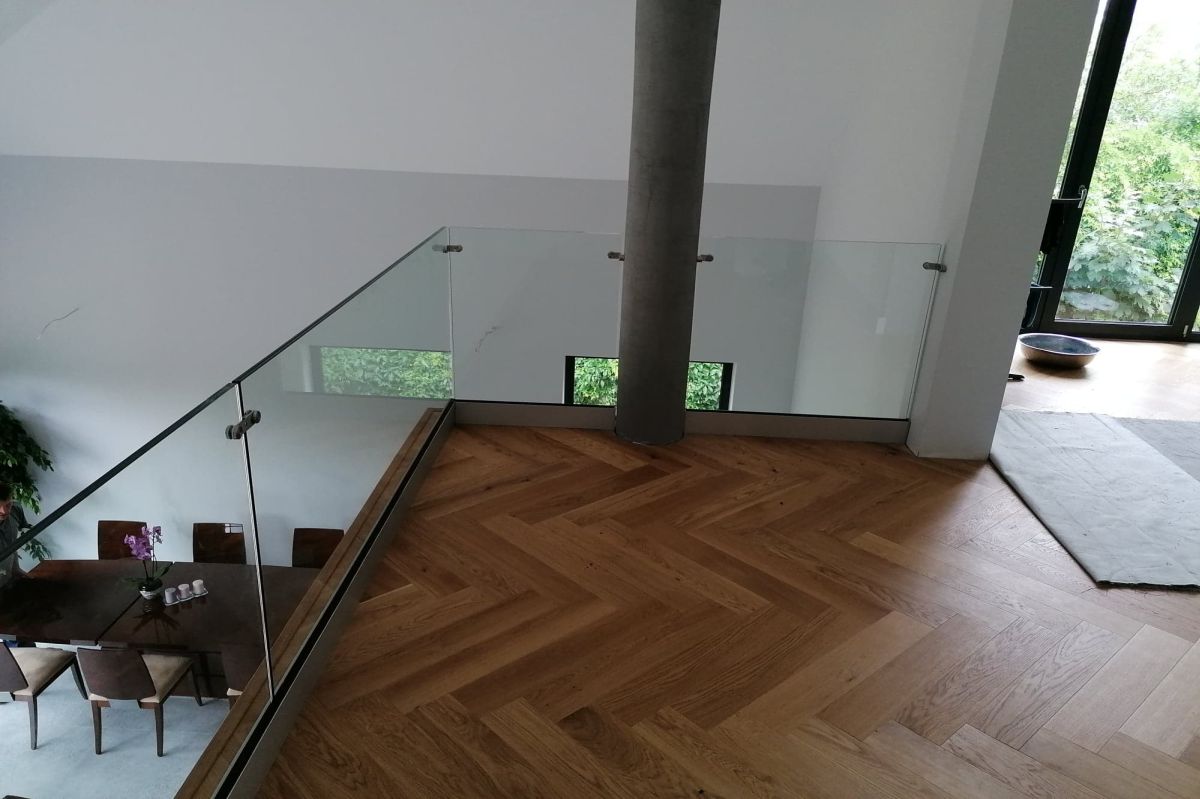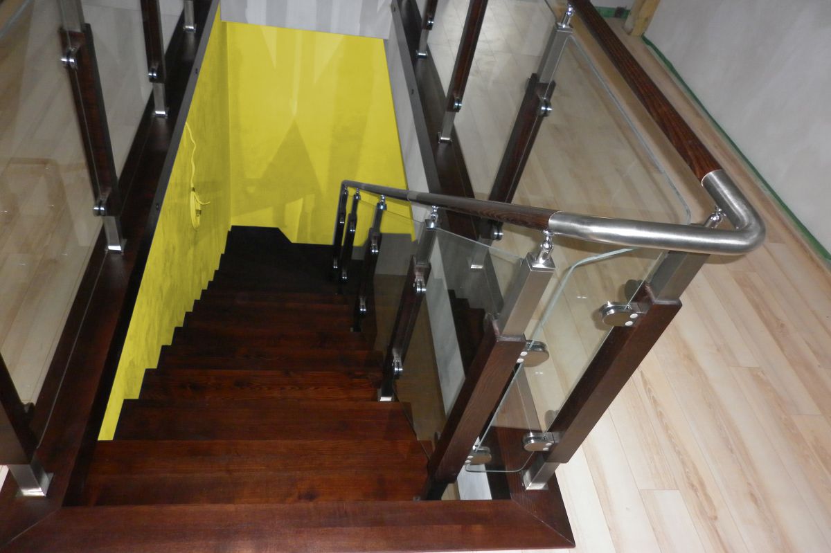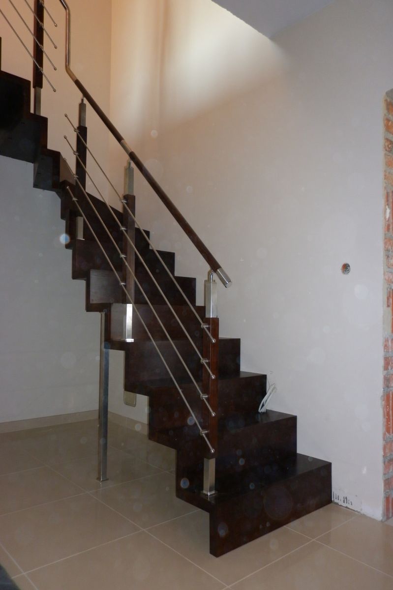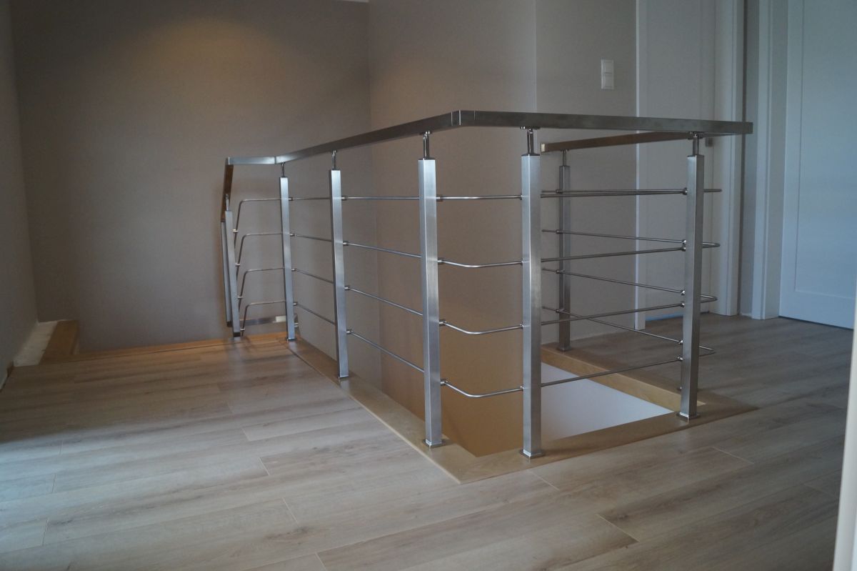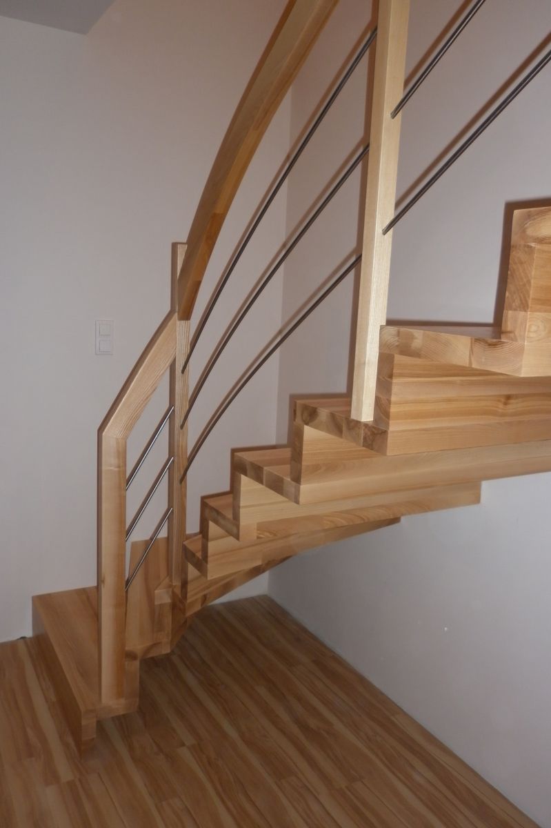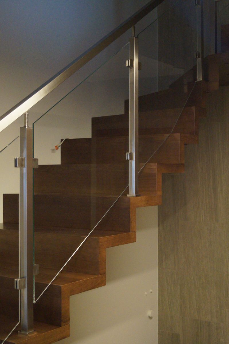 Do tego typu schodów proponujemy nowoczesne balustrady ze stali nierdzewnej połączone ze szkłem lub drewnem, ewentualnie balustradą całoszklaną.