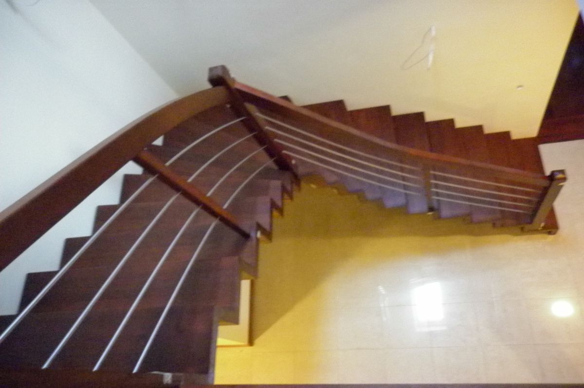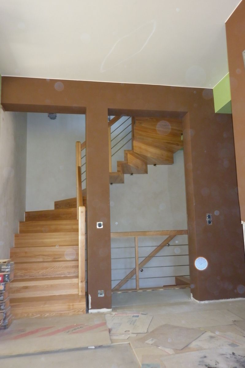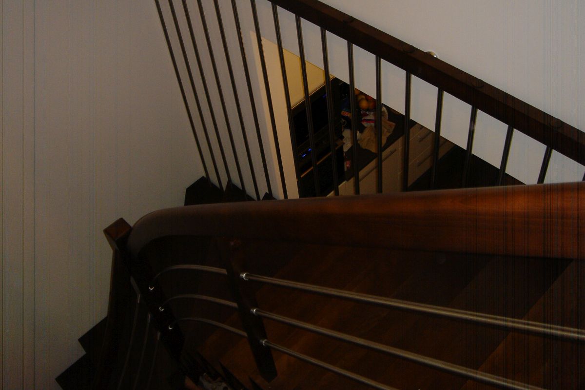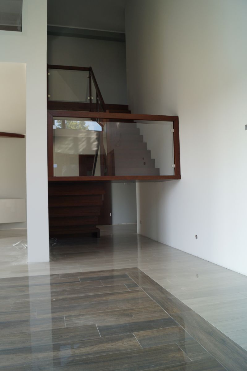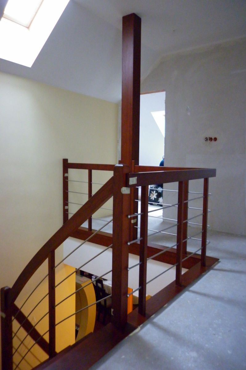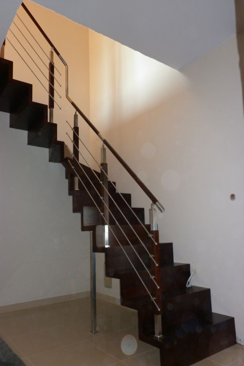 Do tego typu schodów proponujemy nowoczesne balustrady ze stali nierdzewnej połączone ze szkłem lub drewnem, ewentualnie balustradą całoszklaną.